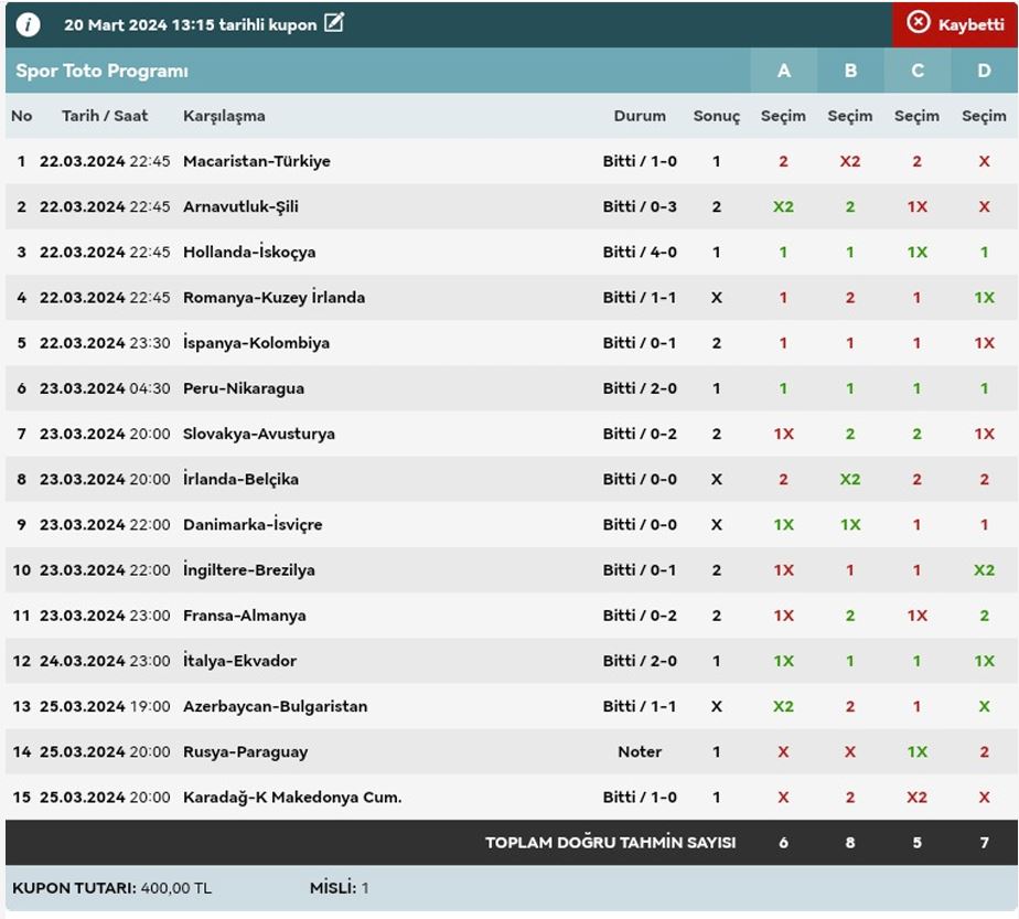 Stake: 400 Return:-